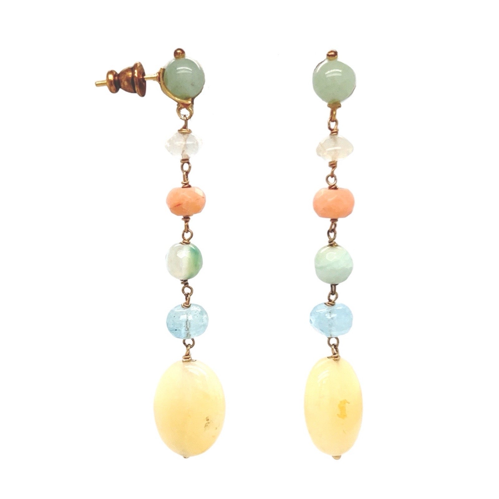Long 6 stone pastel mix, agate and aquamarine bead earrings on golden brass, with a yellow Aventurine tumbled drop (20mm). Length 6cm.