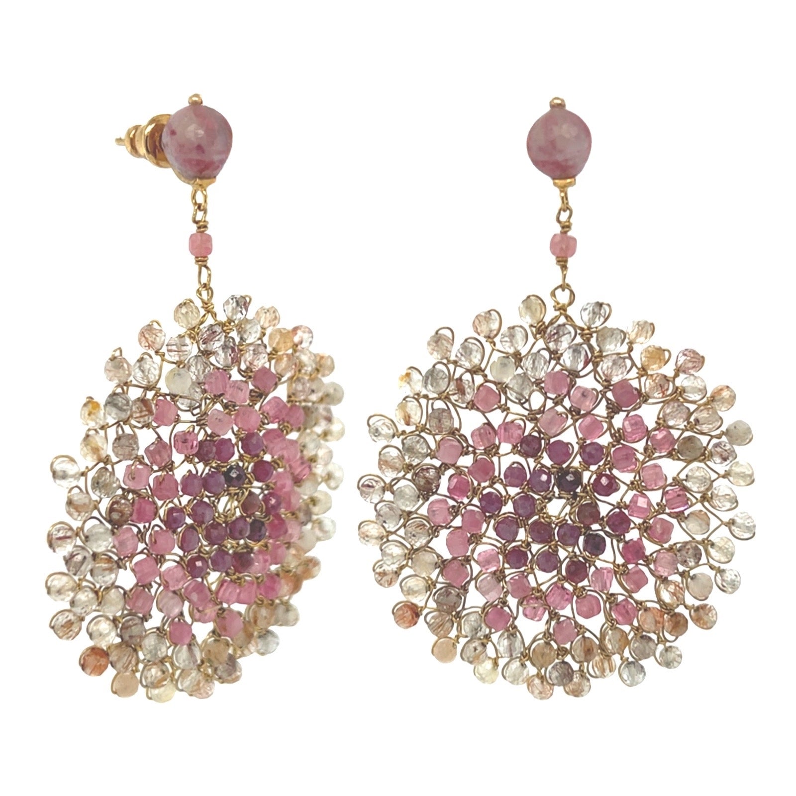 "Sunburst" disk earring woven with multicolour mix of tourmaline, rutilated quartz and pink ruby with post top in golden brass.