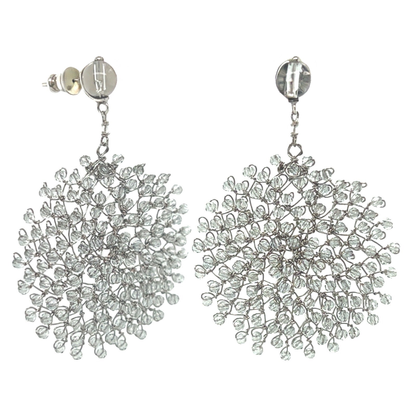 Silver-tone hand-woven "Sunburst" disk earrings in grey crystal, with grey crystal stud top in golden brass.