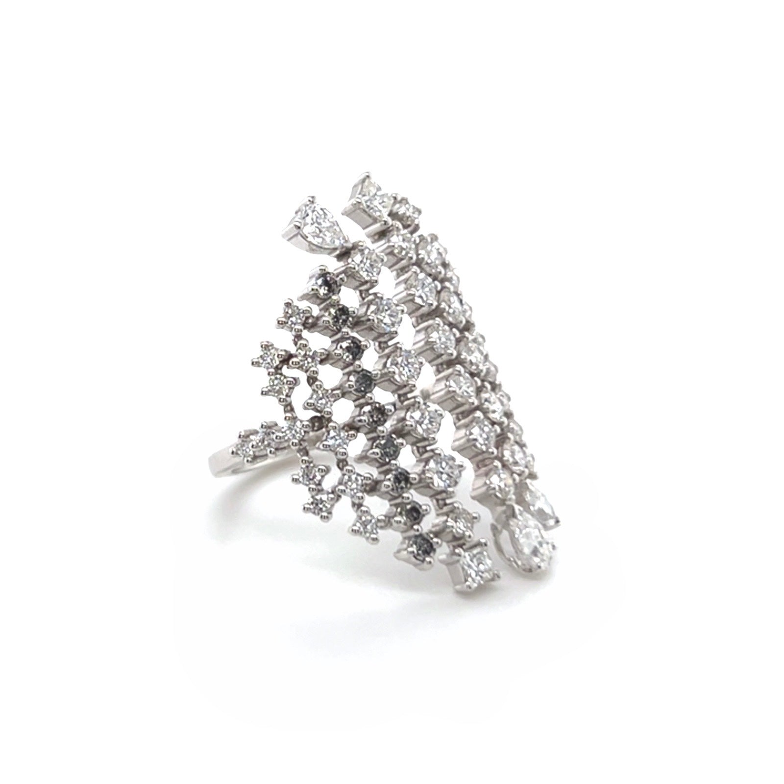 Open bank 18k white gold "Frozen L" ring, set with a tapered mix of round brilliant,  marquise, and pear shaped diamonds weighing 2.150 cts.