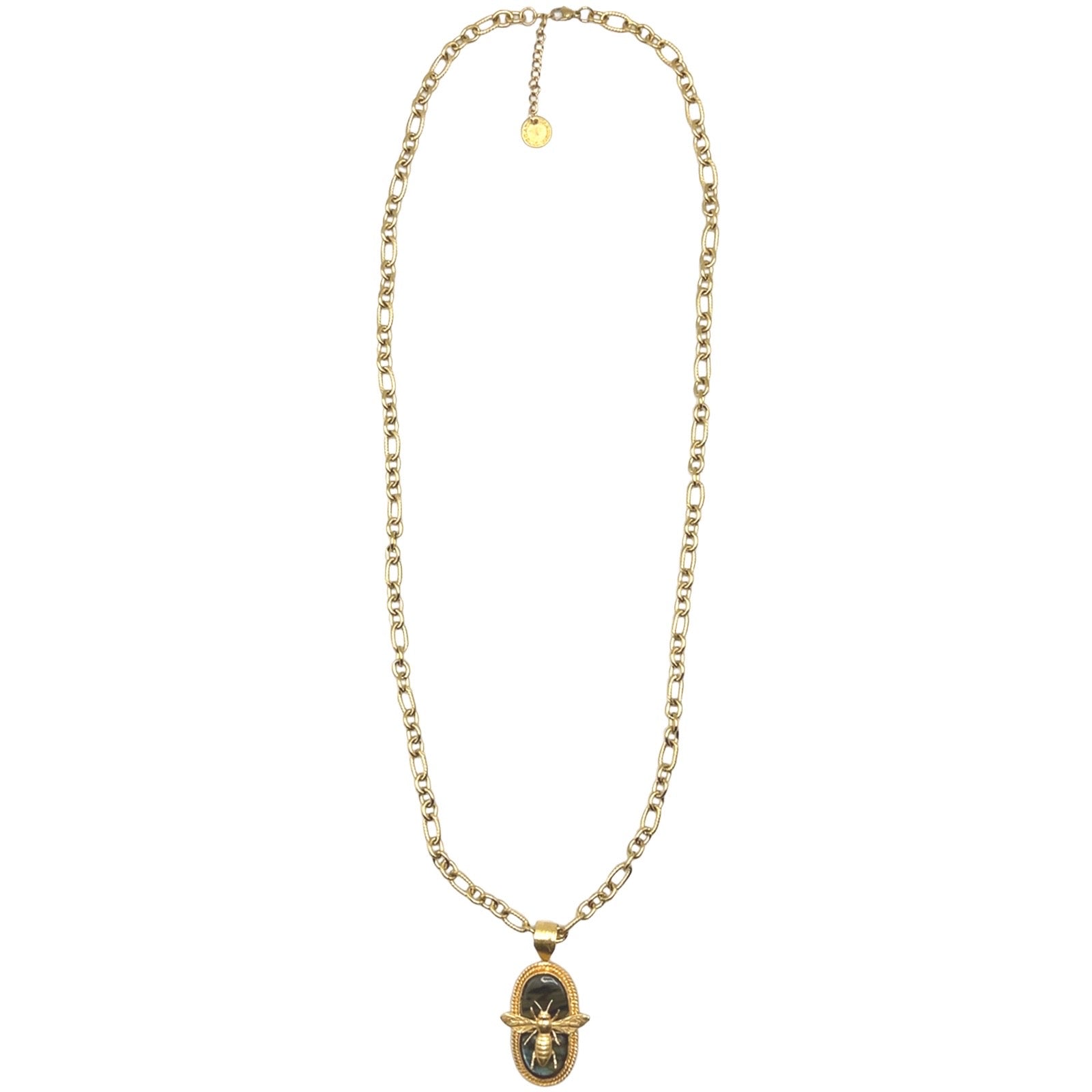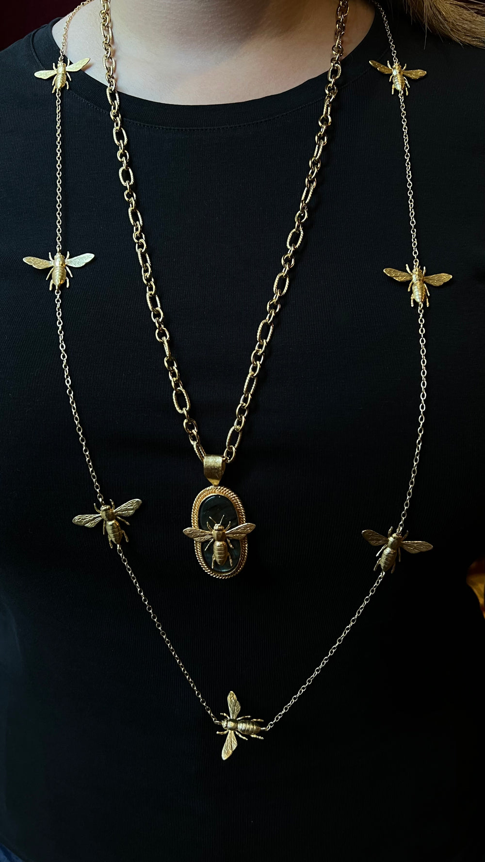 Long guilloché chain necklace with a rainbow labradorite “Bee” pendant.