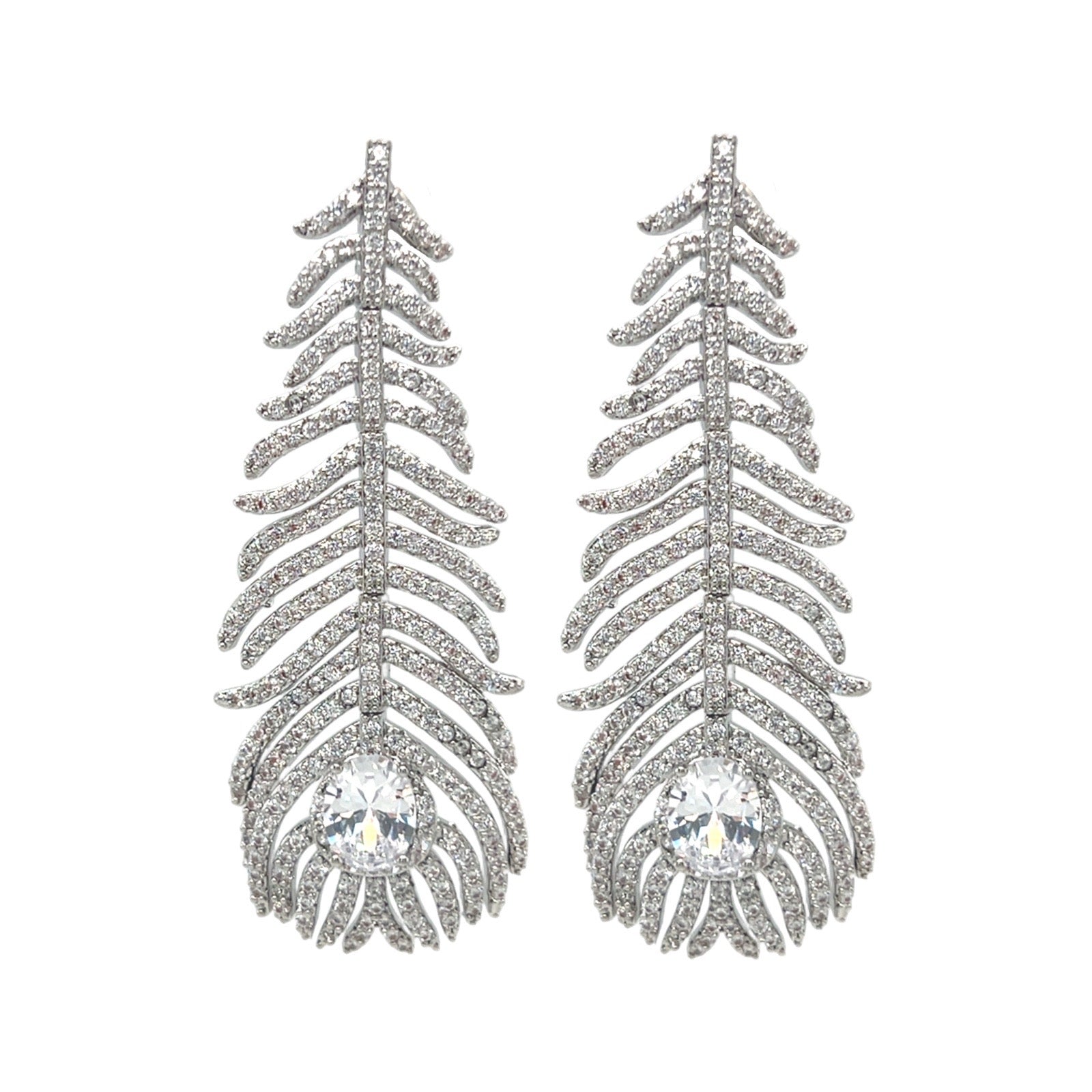 Long diamanté feather earrings with cascading fringes leading to a large strass stone at the base.