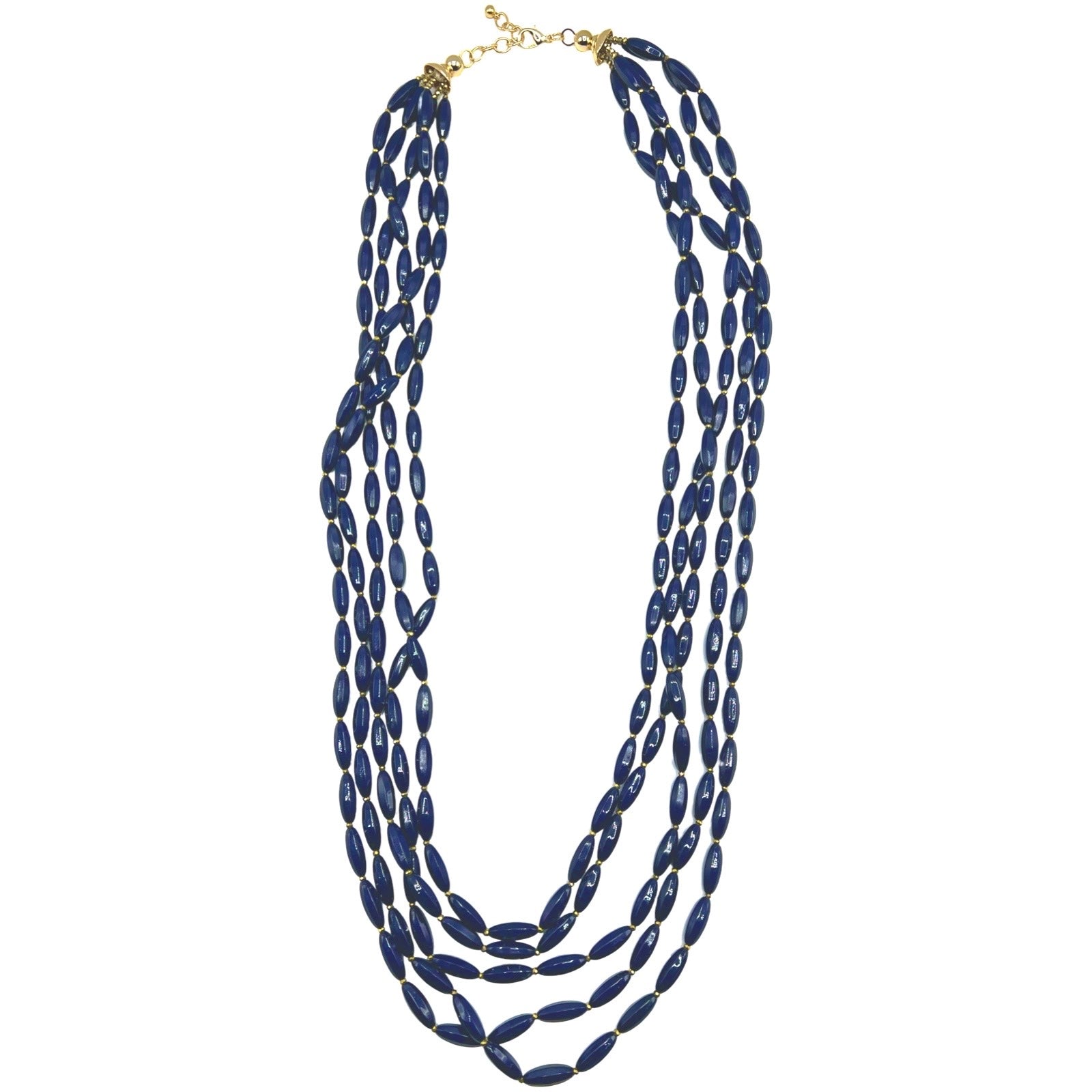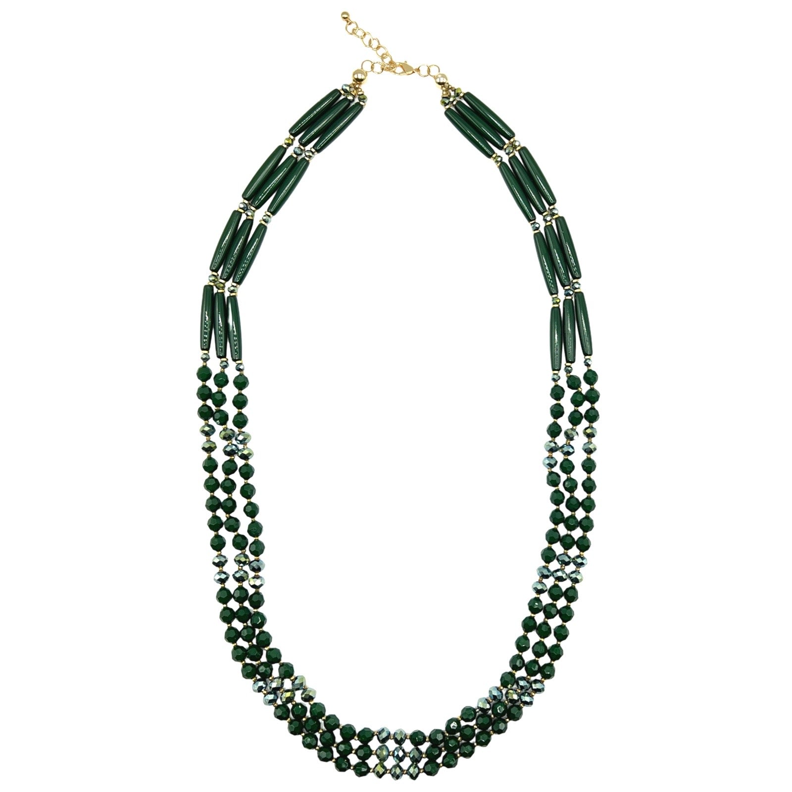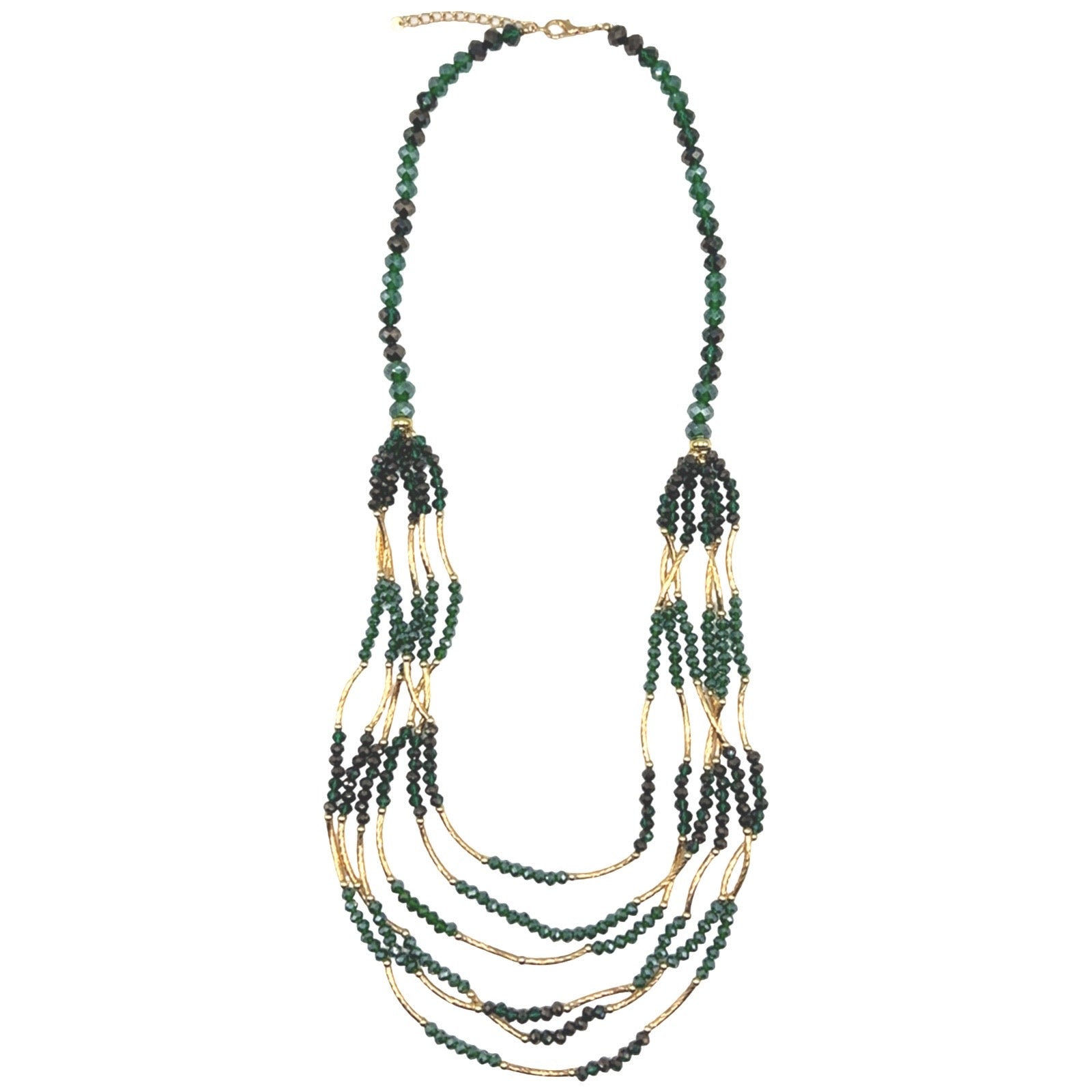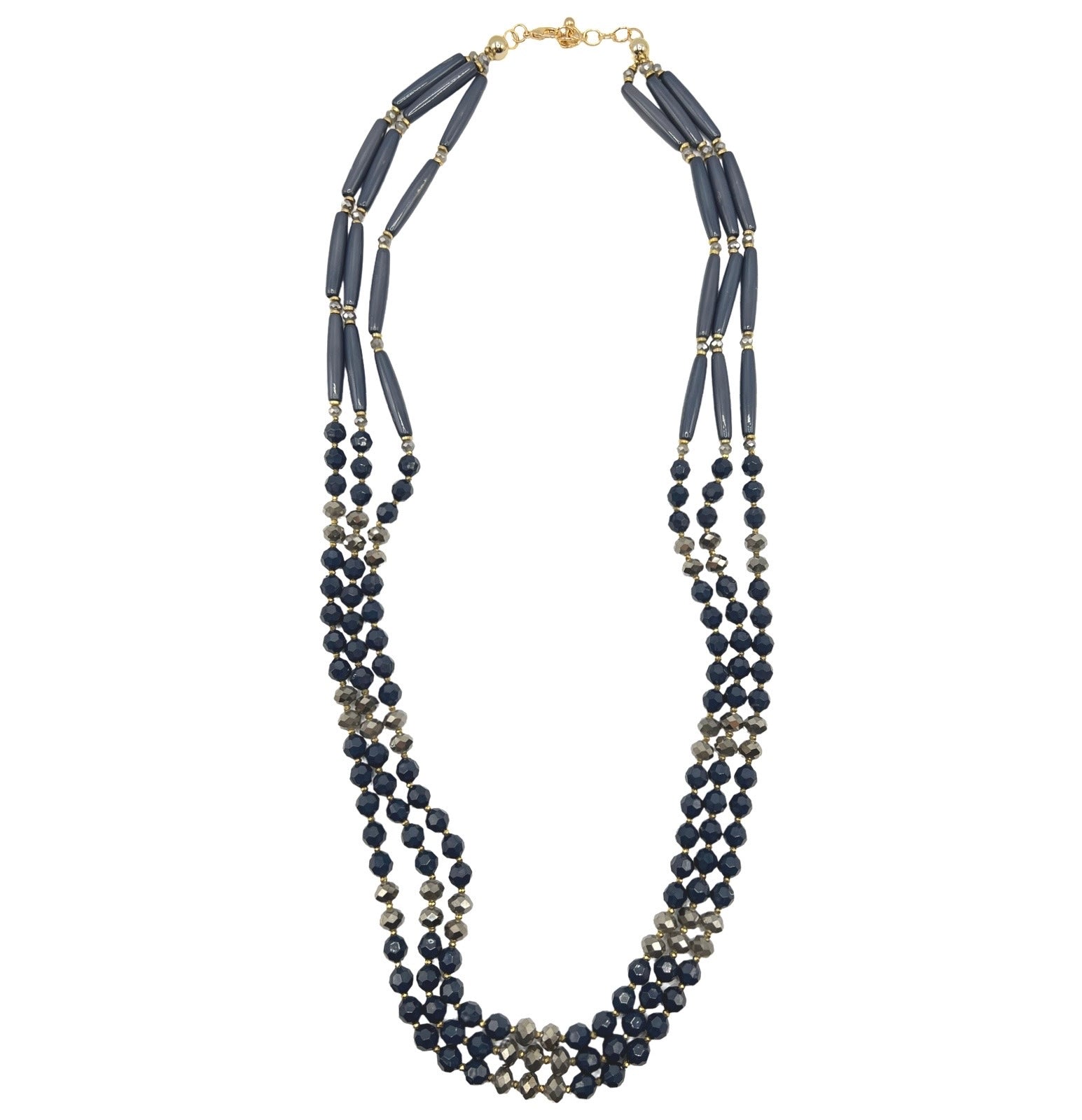 Multi-row extra-long faceted beaded necklace with elongated marquise-shaped navy beads, round dark grey beads, round green beads, and alternating golden sticks with black or green beads.