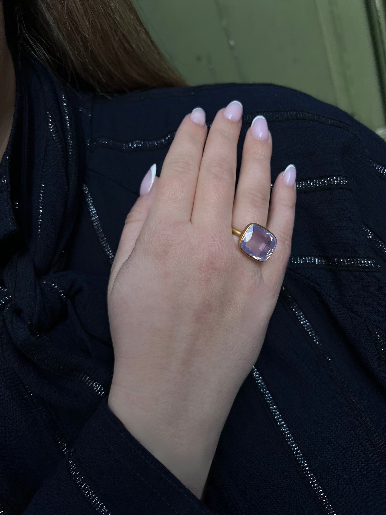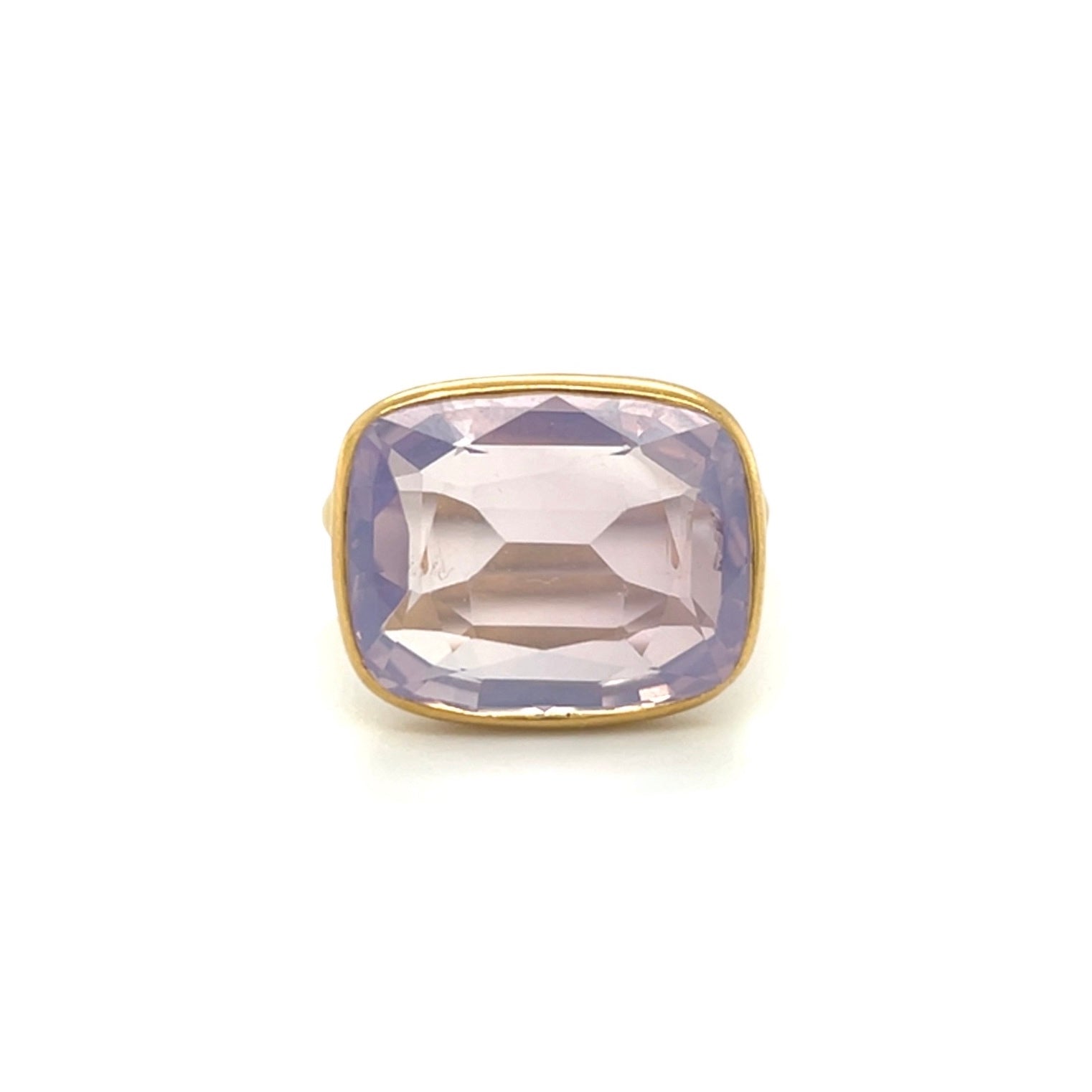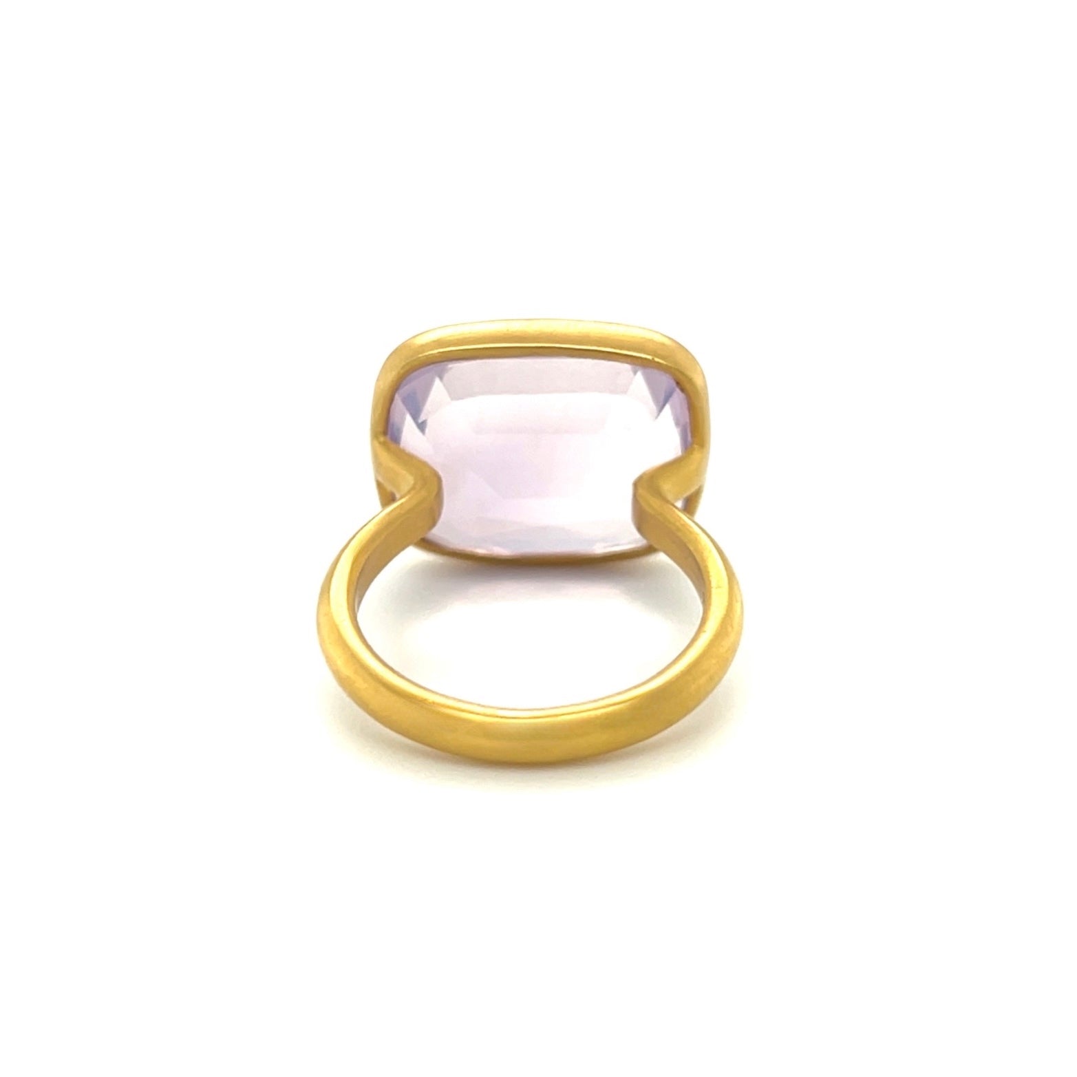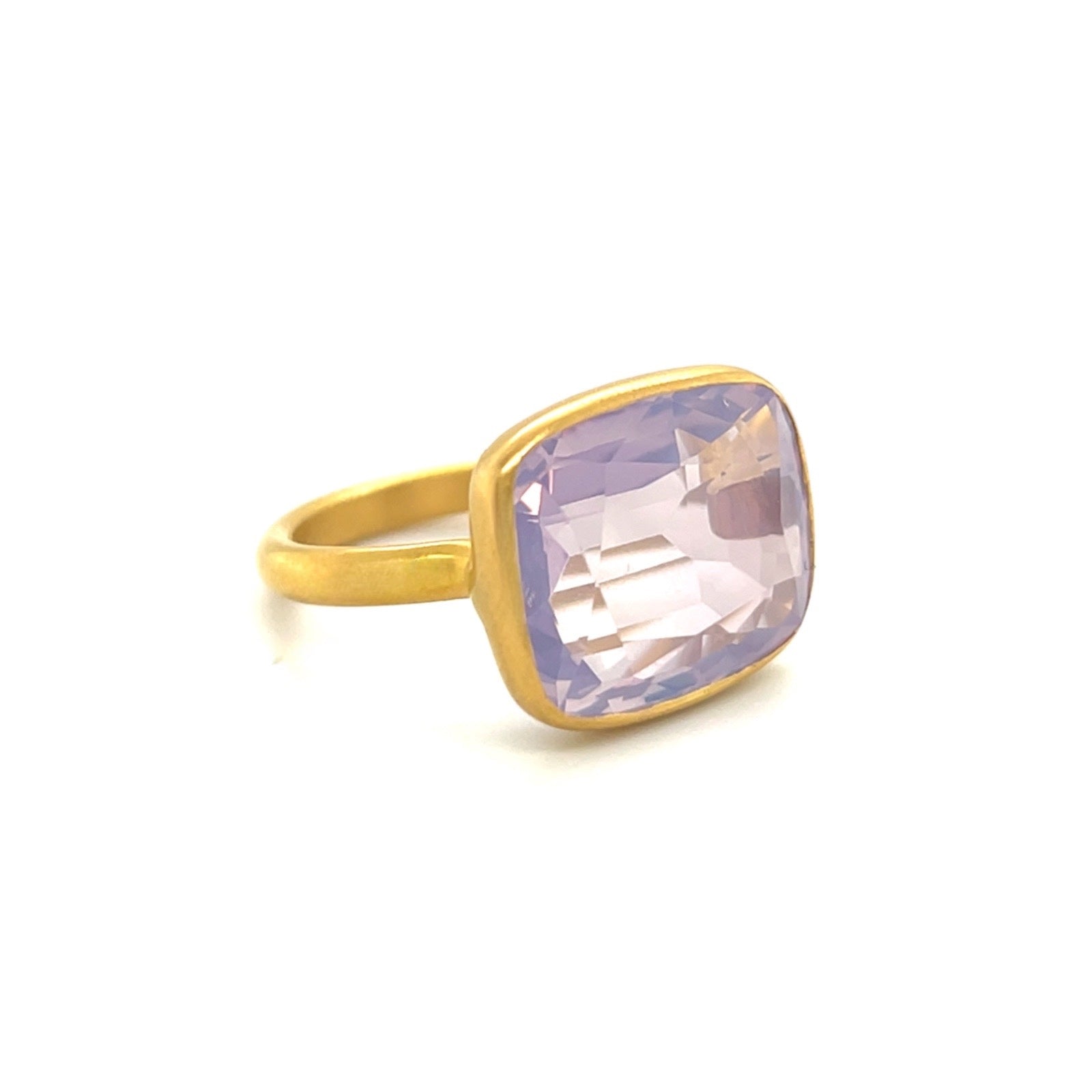Square cushion shaped Lavender Quartz "Princess" ring in 22k yellow gold.