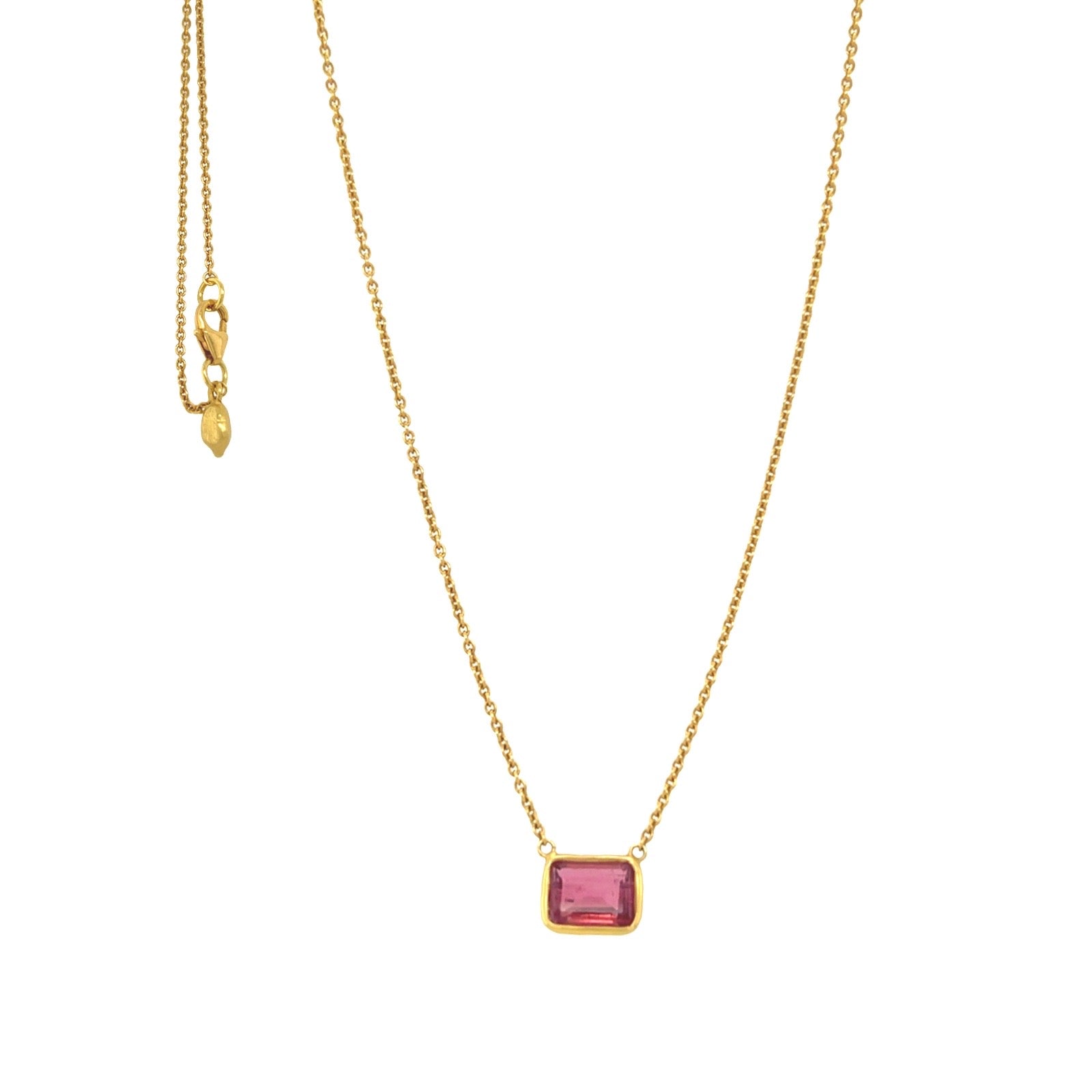 Single pink tourmaline baguette pendant on 18k yellow gold chain necklace with signature clasp.