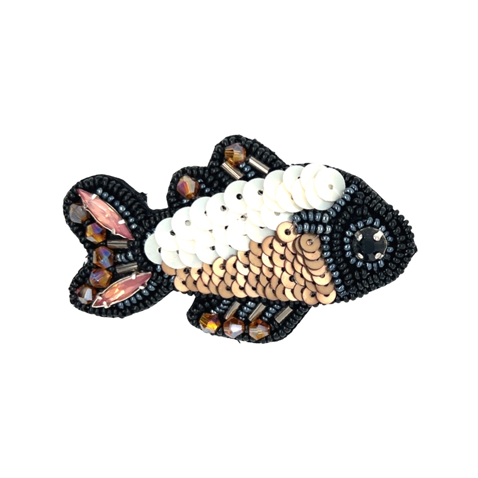 Hand-embroidered brown-toned Fish brooch, featuring a soft black suede backing and a horizontal bar pin with a rotating safety clasp.