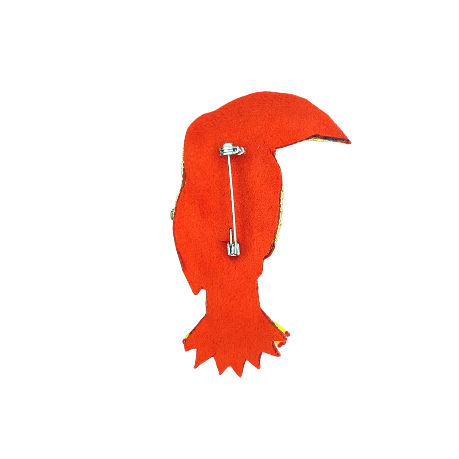 Hand-embroidered yellow beaded Pelican brooch, featuring a soft red suede backing and a horizontal bar pin with a rotating safety clasp.