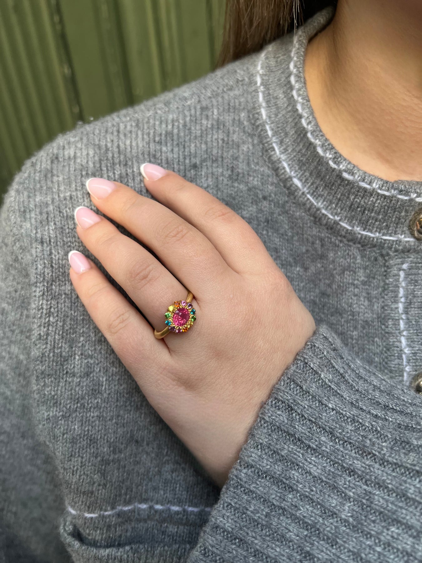 Rainbow "Princess D" ring with a hot pink Spinel mounted in 22k yellow gold.