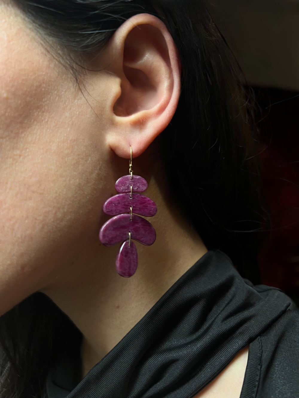 In the hands of Ron and David, rough stones are magically reborn as luminous hand-carved shapes, assembled into balanced compositions for the ears and neckline.