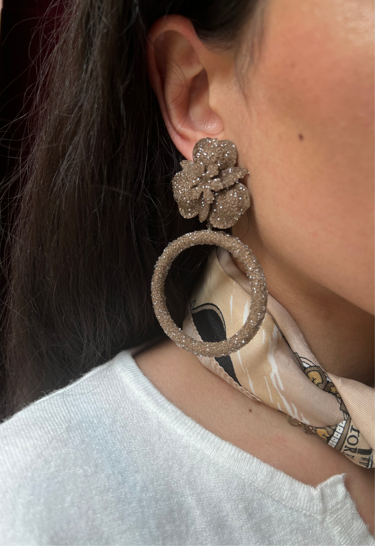 Mink Beige crystal "Blossom Créole" earrings. Omega latch pierced backs. Light weight.