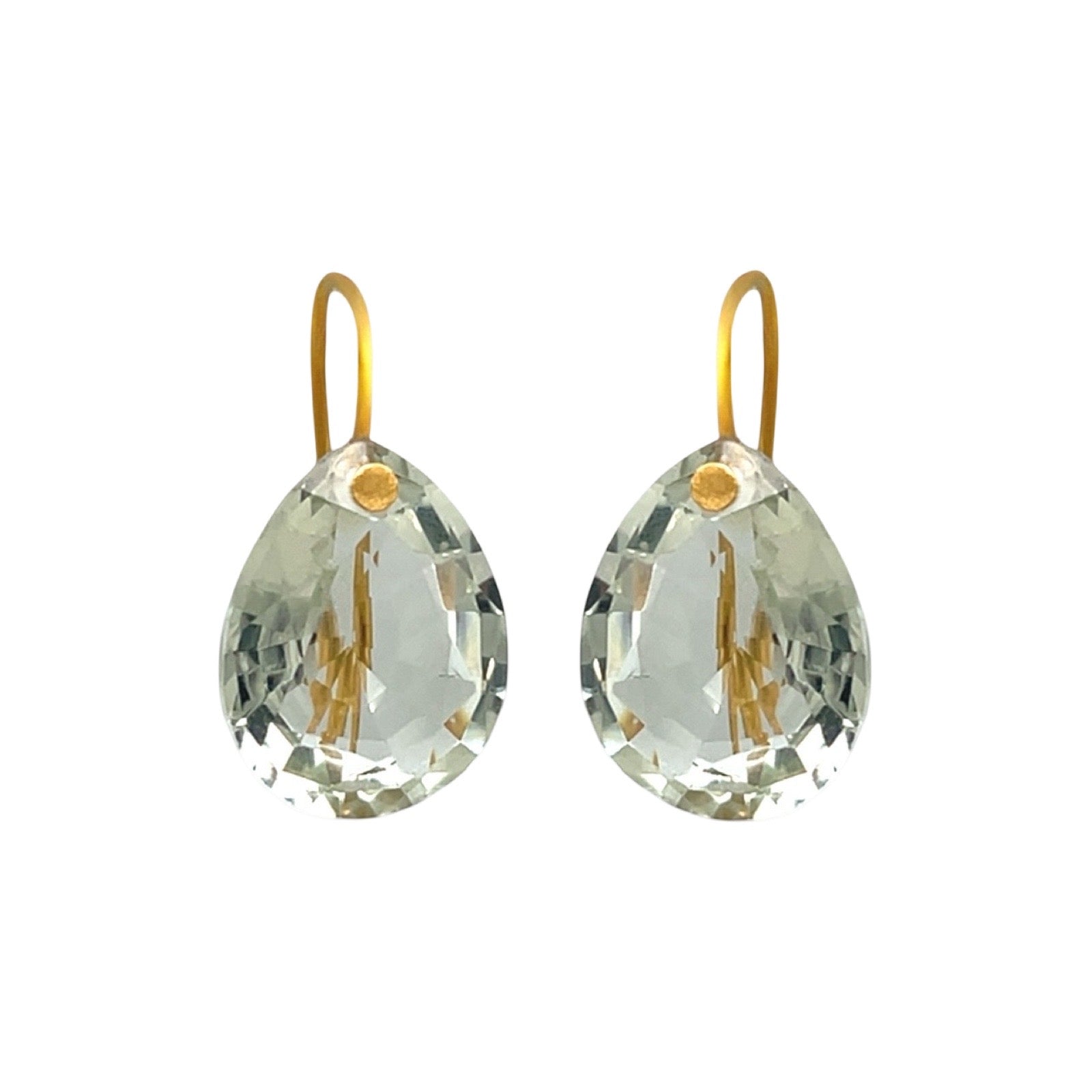Green quartz Pear Shape Gem earrings with gold dots, set in 22k yellow gold.