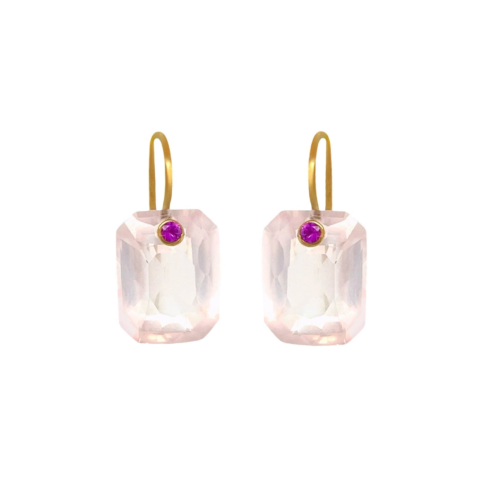 Rose quartz Emerald Cut Gem earrings with pink sapphire dots, set in 22k yellow gold.