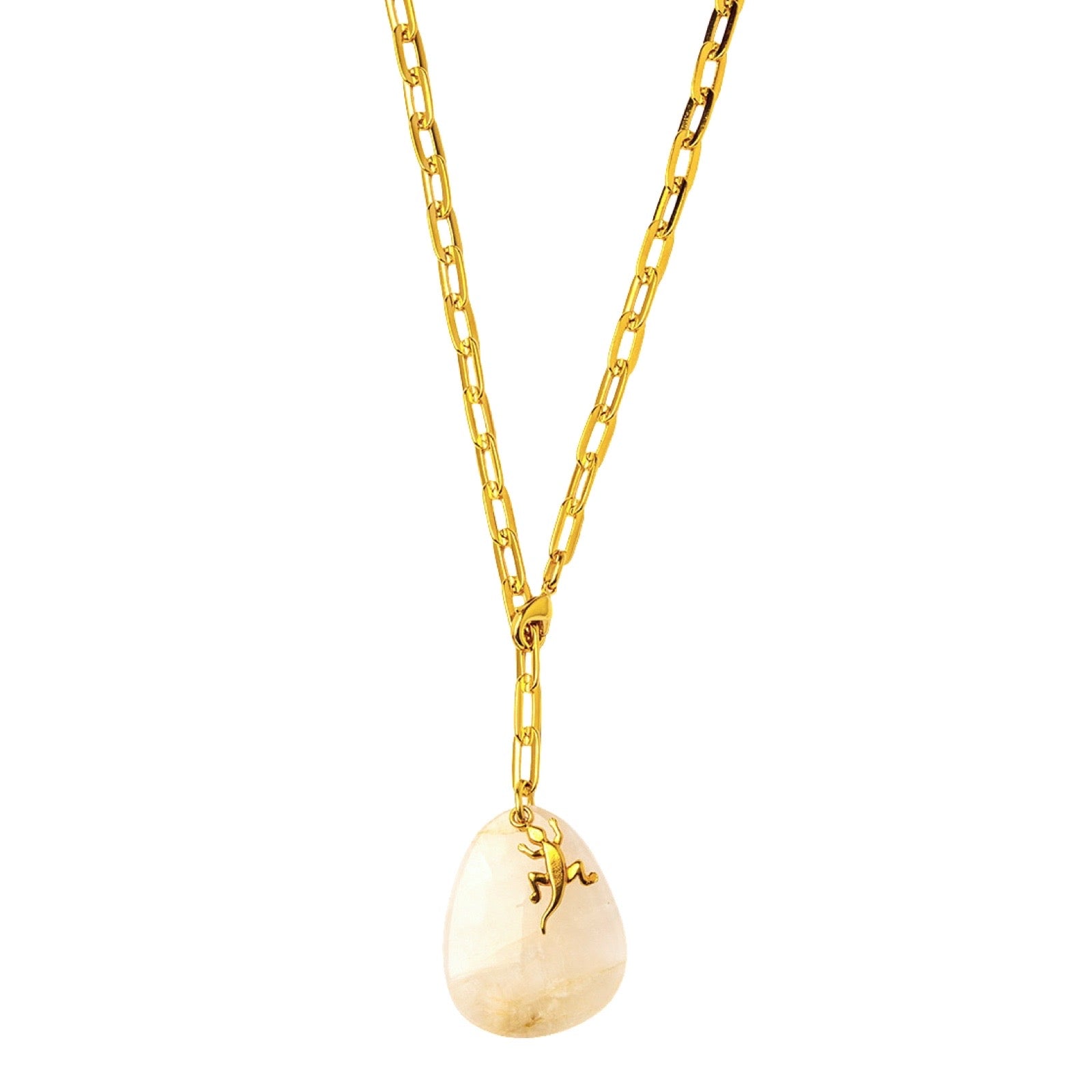 Gold plated lizard and oval white moonstone pendant on a long rectangular patterned gold plated chain with adjustable lobster clasp.